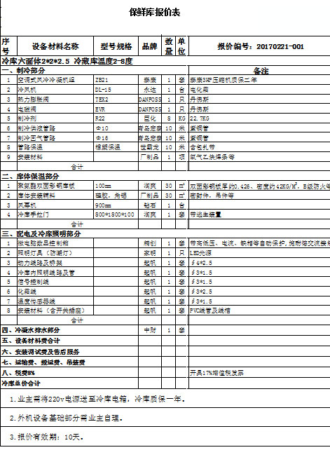 去年7月份想做一點(diǎn)小本買賣,經(jīng)過多方考察,覺得水果生意不錯,就決定開一個水果店,但是之前不是很了解這個行業(yè),然后就想先算一下,盤好店,然后確定好客源就要建冷庫了,朋友介紹說這家晶雪制冷做冷庫的還不錯,就聯(lián)系了這家公司。開始還是很擔(dān)心的,以為要投資很大,結(jié)果聯(lián)系了這家公司之后,發(fā)現(xiàn)還蠻專業(yè)的??头敿?xì)的詢問了我的要求,沒過一會兒,就有專業(yè)的技術(shù)人員給我聯(lián)系,然后給我做了一份報價,下面是他們給我的報價單: